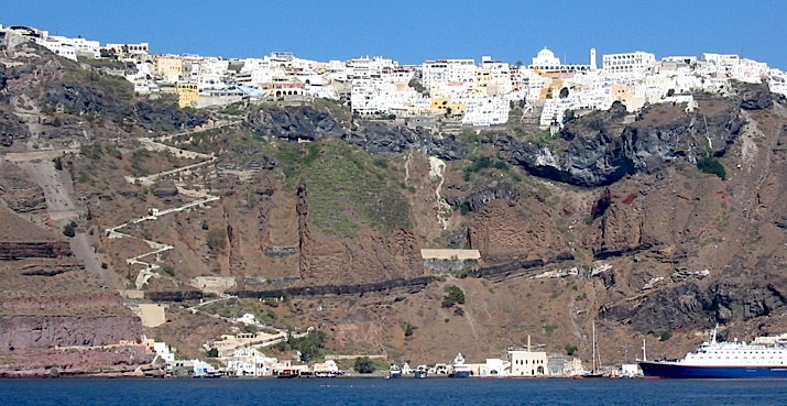 Visite de l'ancienne Thiria, longue de 800 m sur 150 m de large, perchée sur une longue croupe rocheuse à 300 m d'altitude (ci-contre). Visite des ruines d'Akrotiri, qui fut enfouie sous une couche protectrice de cendres volcaniques et réapparut à la lumière en 1967. Aucun squelette, aucun trésor n'ayant été découvert, on pense que les habitants ont eu le temps de rassembler leurs objets de valeur et de fuir avant la catastrophique explosion finale. Visite d'Episkopi, du monastère de Saint Ilia et d'Oia. Déjeuner en cours de route. Ferry pour Héraklion, dîner et nuit à l'hôtel.