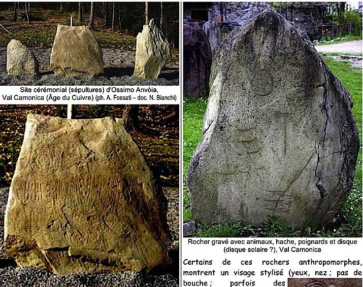 Mots-clés : art rupestre, Val Camonica, statues-menhirs, stèles, anthropomorphes, orants, méandres, spirales, cupules