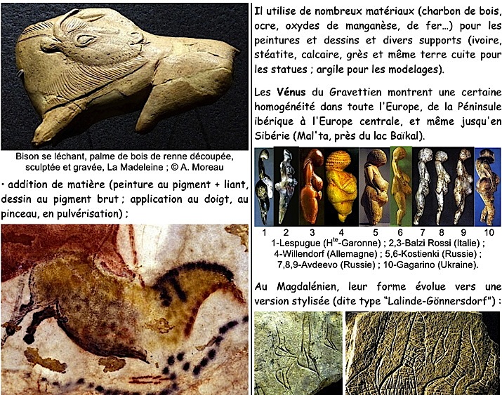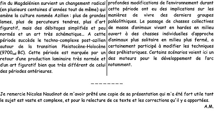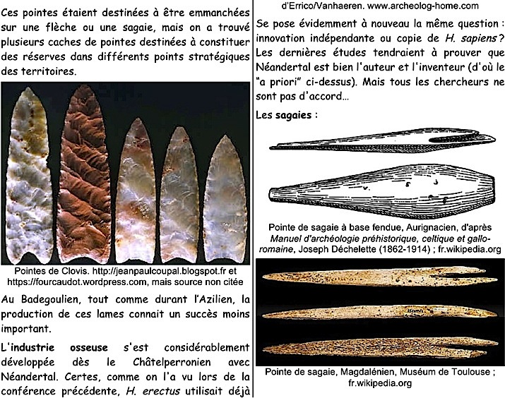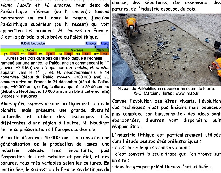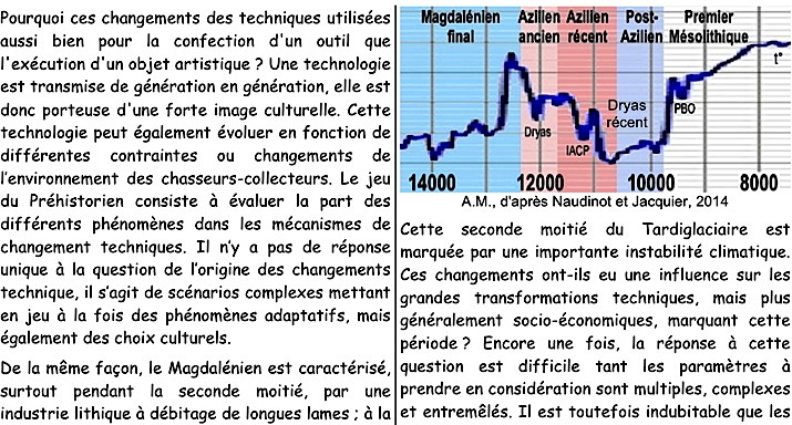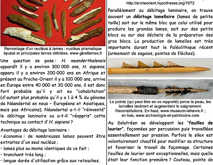 Mots-clés : Homo sapiens, Paléolithique, Paléolithique, Châtelperronien, Aurignacien, Gravettien, Epigravettien, Solutréen, Badegoulien, Magdalénien, Azilien, Tardiglaciaire, industrie lithique, débitage laminaire, laminaire, feuille de laurier, pointe de Clovis, industrie osseuse, sagaie, harpon, aiguille à chas, bâton percé, art mobilier, art pariétal