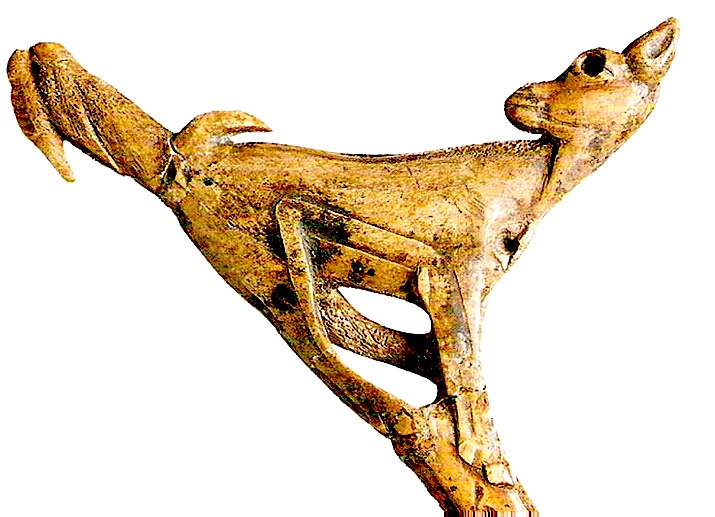 Partie distale d'un propulseur trouvé au Mas d'Azil (Ariège), à sculpture en ronde-bosse assez aplatie, dit "Le faon aux oiseaux", bien qu'il s'agisse plus probablement d'un isard que d'un faon. A cause de la relative fragilité de sa forme, il est possible que ce soit plutôt un objet rituel qu'une véritable arme de chasse.