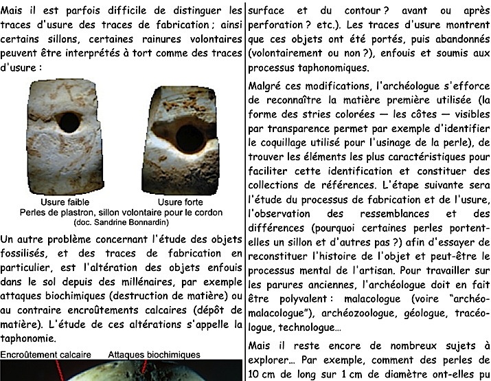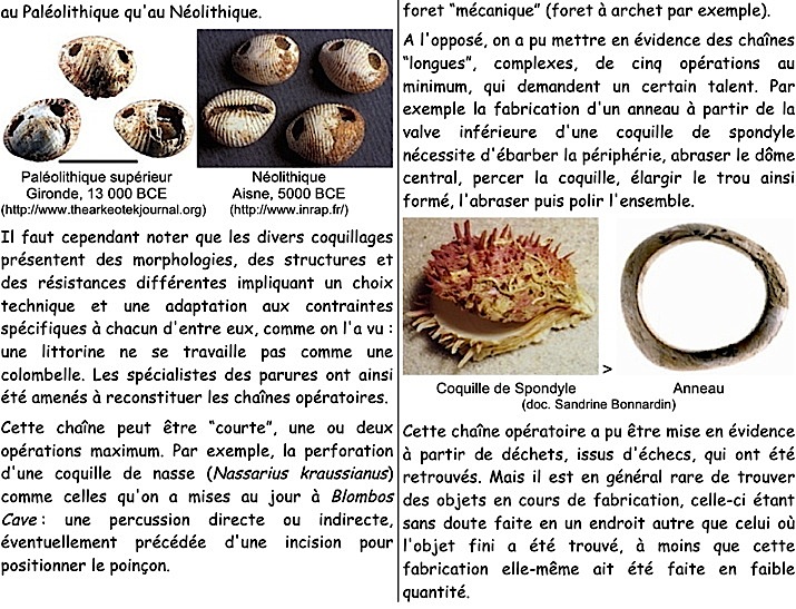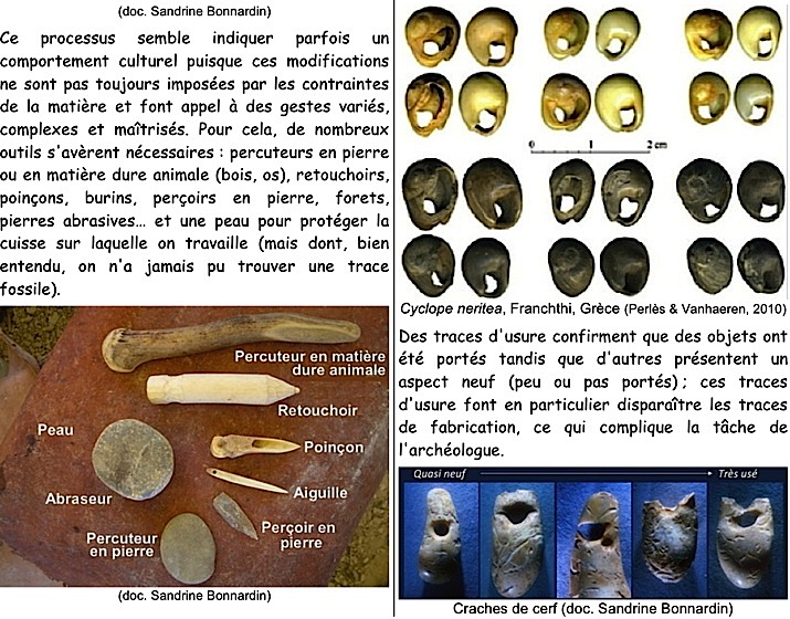 Mots-clés : coquillage, littorine, colombelle, dentale, cauris, cardium, crache de cerf, cornaline, perle, discoïde, bracelet, plastron, percussion, perçage, abrasion, chaîne opératoire, taphonomie