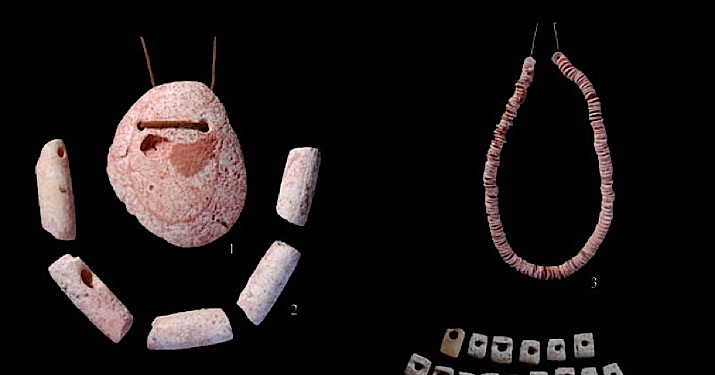 1 : applique biforée en coquille de spondyle ; 2 : collier de perles tubulaires en coquille de spondyle ;