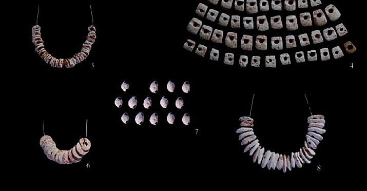 7 : coquilles de cauris perforées (Trivia monacha) ; 8 : collier de perles ovalaires en coquille.