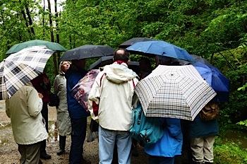 Départ le matin en direction de la source du Lison, affluent de la Loue, résurgence spectaculaire dans un cadre naturel de verdure, à la fois magnifique et reposant où on découvre sa grotte et sa cascade bien alimentée en eau par les pluies récentes. Notre guide (parapluie bleu clair au centre) nous y a conté son histoire et le long périple de ses eaux avant qu'elles ne revoient la lumière, au cours d'un moment hors du temps.