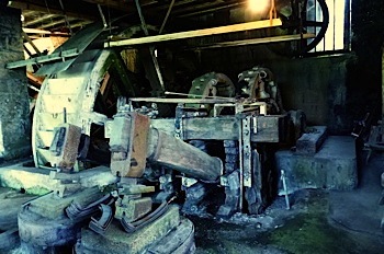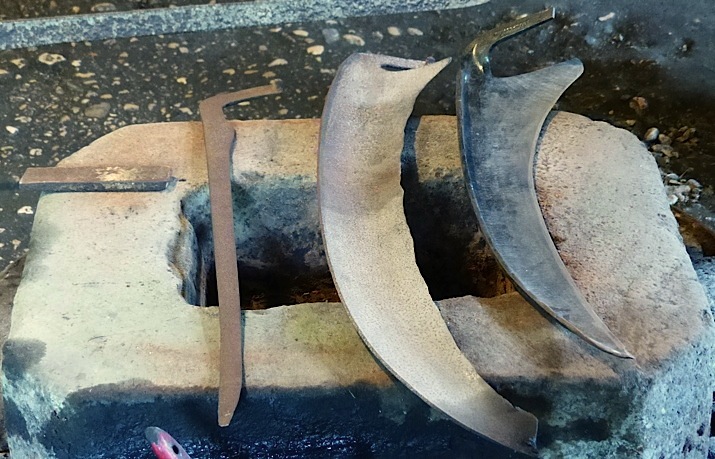 Continuation jusqu’à la Taillanderie de Nans-sous-Sainte-Anne pour une visite encore hors du commun, avec mise en marche d'un martinet (mû par un moteur électrique contrairement à ceux de la photo à gauche qui étaient mûs par la force hydraulique grâce à la grande roue à augets ) et démonstration bruyante de ce qu'était le travail des taillandiers. Le guide nous a expliqué comment, à partir d'un petit lingot de fer (à gauche sur la photo ci-dessous) on obtenait une première ébauche, puis une seconde et enfin l'outil fini, une faux (à droite), en changeant à chaque étape l'outil monté sur le martinet.