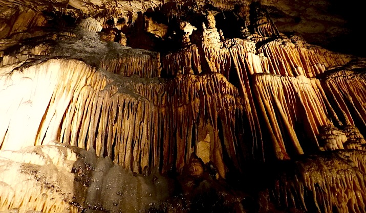 Continuation pour la découverte des grottes où l'on traverse, sur un parcours de 600 m, des salles très hautes, pouvant aller jusqu'à 70 m… L'accès à la grotte s'est fait en passant sous une impressionnante cascade qui n'aurait pas dû exister en cette saison : la rivière souterraine, après avoir creusé son lit, crée une résurgence une dizaine de mètres en contrebas vers le sud (hors photo, en bas à gauche), mais gonflée par les nombreuses journées de pluie qui ont précédé notre visite, son niveau s'est fortement élevé provoquant cette cascade au niveau d'une ancienne sortie.
