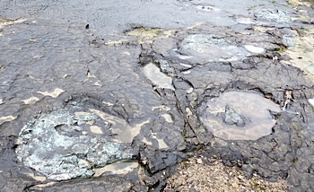 Départ le matin vers Loulle pour la découverte (sous la pluie) des empreintes de dinosaures. Situé dans une carrière et découvert depuis peu, c'est un site à piste de dinosaures. Ci-contre, des empreintes de grande dimension (env. 1 m), une piste qui pourrait avoir été laissée par un cousin du brachiosaure vu précédemment.