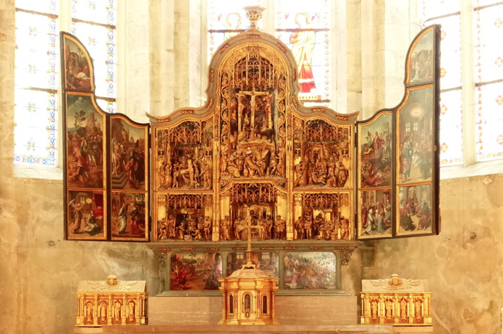 L’après-midi, une visite guidée de l’Abbaye impériale Baume-les-Messieurs était programmée, mais n'a pu avoir lieu pour cause d'installation de matériel sono pour une prestation musicale le soir même !… Nous avons cependant pu nous y promener librement, au milieu des câbles, des haut-parleurs, des projecteurs… D'origine carolingienne, voire mérovingienne, l'abbaye se développe ensuite sous l'ordre des moines de Cluny. Situé au pied des falaises et au croisement de trois vallées, c'est un bâtiment imposant où on découvre entre autre une chapelle et son retable en chêne taillé, peint et doré, un triptyque flamand de 1525.