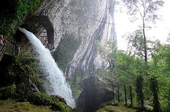 Puis une petite marche en montée le long d'une rivière bondissante et rugissante nous a menés jusqu'à la Grotte Sarrazine et sa résurgence.
