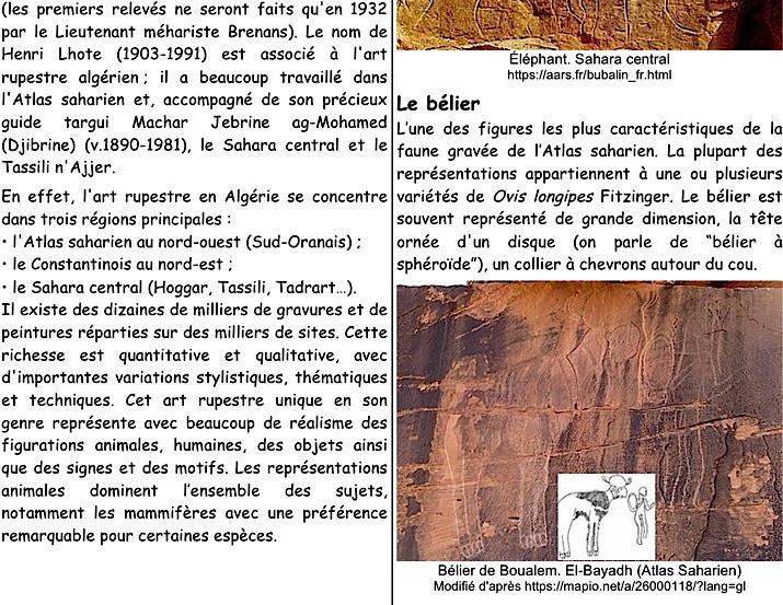 Mots-clés : Atlas saharien, Sahara central, Ain Hanech, Aïn El Ahnech, Tighennif, Tighenifine, Atérien, Ibéromaurusien, Capsien, Tiout, Thyout, Machar Jebrine ag-Mohamed (Djibrine), bélier à sphéroïde, style naturaliste, style sub-naturaliste, style de Tazina, style schématique, têtes rondes, théranthrope, bubalin, bovidien, caballin, camelin