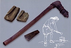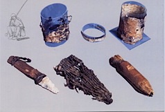 Couteau en silex, fourreau, retouchoir Arc, flèches, carquois Hache de cuivre, moule récipients en écorce de bouleau